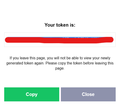6.) คัดลอกรหัสโทเคน (Token) จากช่อง "Your token is:" ทั้งหมด หรือ กดปุ่ม Copy สีเขียว เพื่อคัดลอกรหัสโทเคน (Token) ทั้งหมด